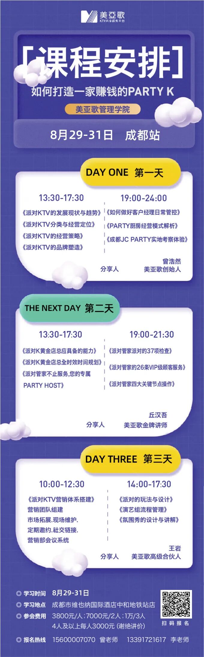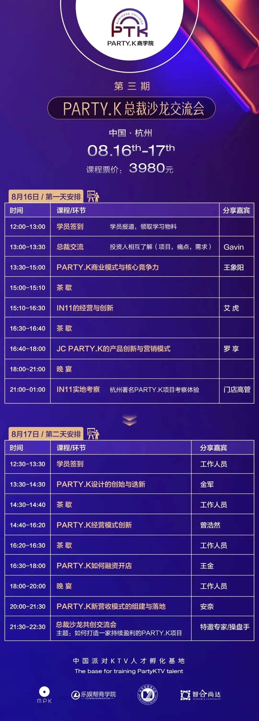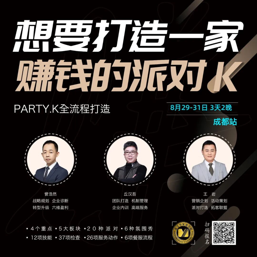 《如何打造一家赚钱的PARTY.K》课程定于8月29-31在成都举办!席位限量,欢迎大家做好课程预定。
