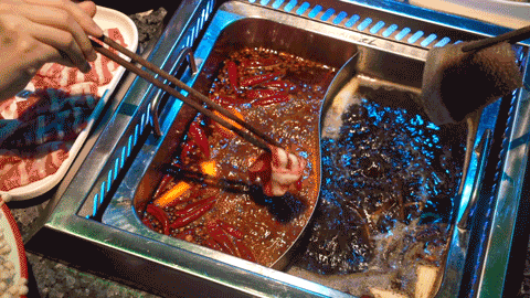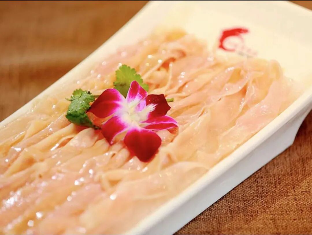 色泽粉嫩、鲜脆可口的鸭肠,放入锅中等待10s就可以开吃啦,吸饱汤底的鸭肠微微卷起,口感又弹又嫩,简直是味蕾的极致享受。