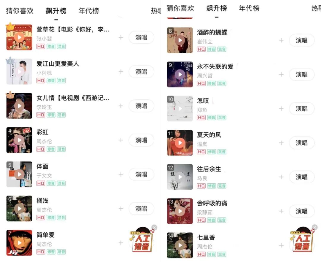 这些通过网络以及作为短视频bgm走红的歌曲,也在线上K歌APP中发挥了更强的生命力。在全民K歌等APP的热门榜单中,几乎已经呈现了网络神曲与传统金曲二分天下的格局。
