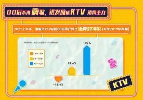 美团APP数据显示,2021上半年,量贩式KTV全国00后用户相比2019年同期下降13.4%,而60-70岁用户同比增长29.6%,70-80岁用户同比增长100%。