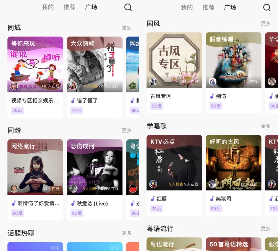 在全民K歌、唱吧等APP上,有基于主题、风格、年代、地域等不同维度的线上歌房,用户能以歌寻友。