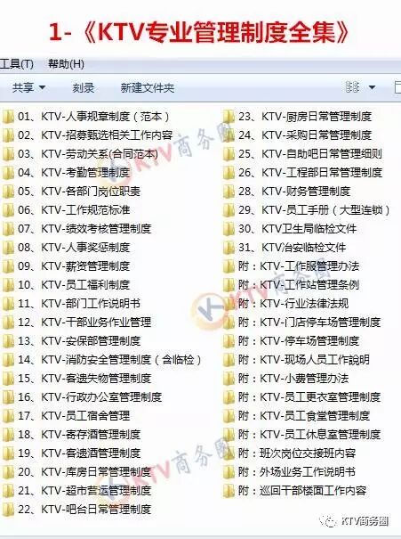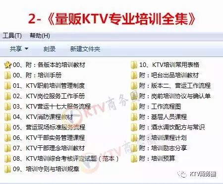 ●KTV经营的百科全集,汇集了所有KTV管理制度、营运表格、培训教材、营销案例、培训视频、开业筹备、KTV宣传VI素材、水吧饮品制作.....等等。