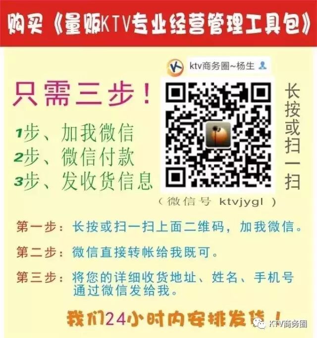 特别提醒1:凡购买《量贩KTV专业经营管理工具包》的朋友既成为KTV商务圈的终身VIP会员,KTV商务圈承诺,往后还将免费更新超本工具包20%以上内容量的干货资料,将通过微信或邮箱向VIP会员推送更新的内容。