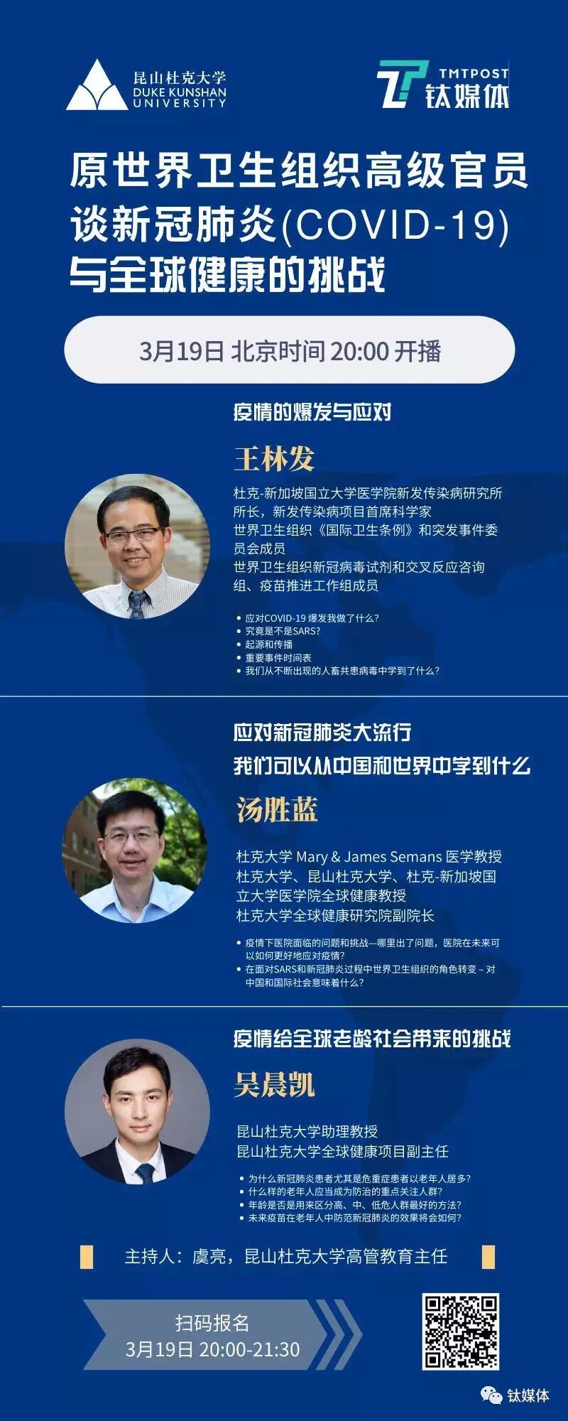 疫情突至,来势汹汹。新冠肺炎(COVID-19)的影响逐步扩散至全球,引起国际关注与思辨。昆山杜克大学和钛媒体联合发起直播活动,旨在集合杜克大学、昆山杜克大学以及杜克大学-新加坡国立大学医学院的教授学者,与大家分享新冠肺炎(COVID-19)的大流行带来的全球健康的挑战。