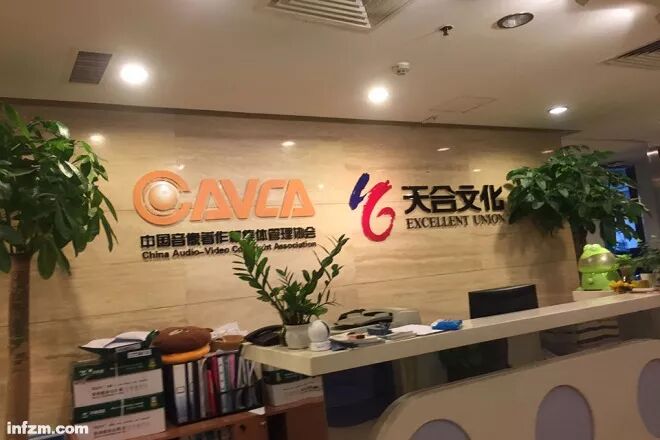 ▲2018年12月7日,南方周末记者走访了天合集团在北京的办公室,公司前台除了张贴天合集团的标识外,还并排挂着音集协的LOGO。(南方周末记者 李在磊/图)