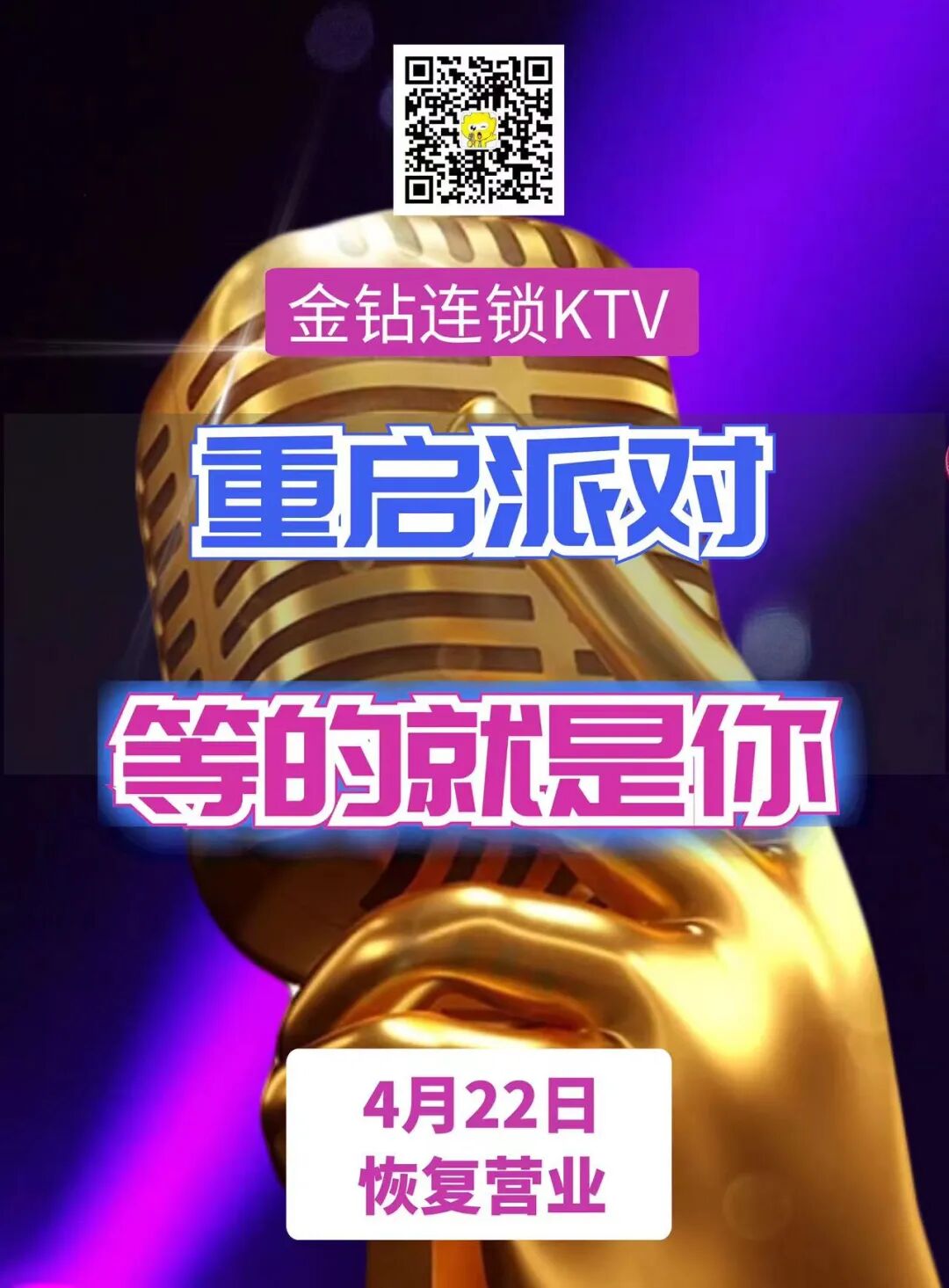 今晚开业,重启派对!场所已全面消毒,特惠活动百威啤酒两件仅需418元,会员充值赠送10%优惠折上折!预定电话5758888