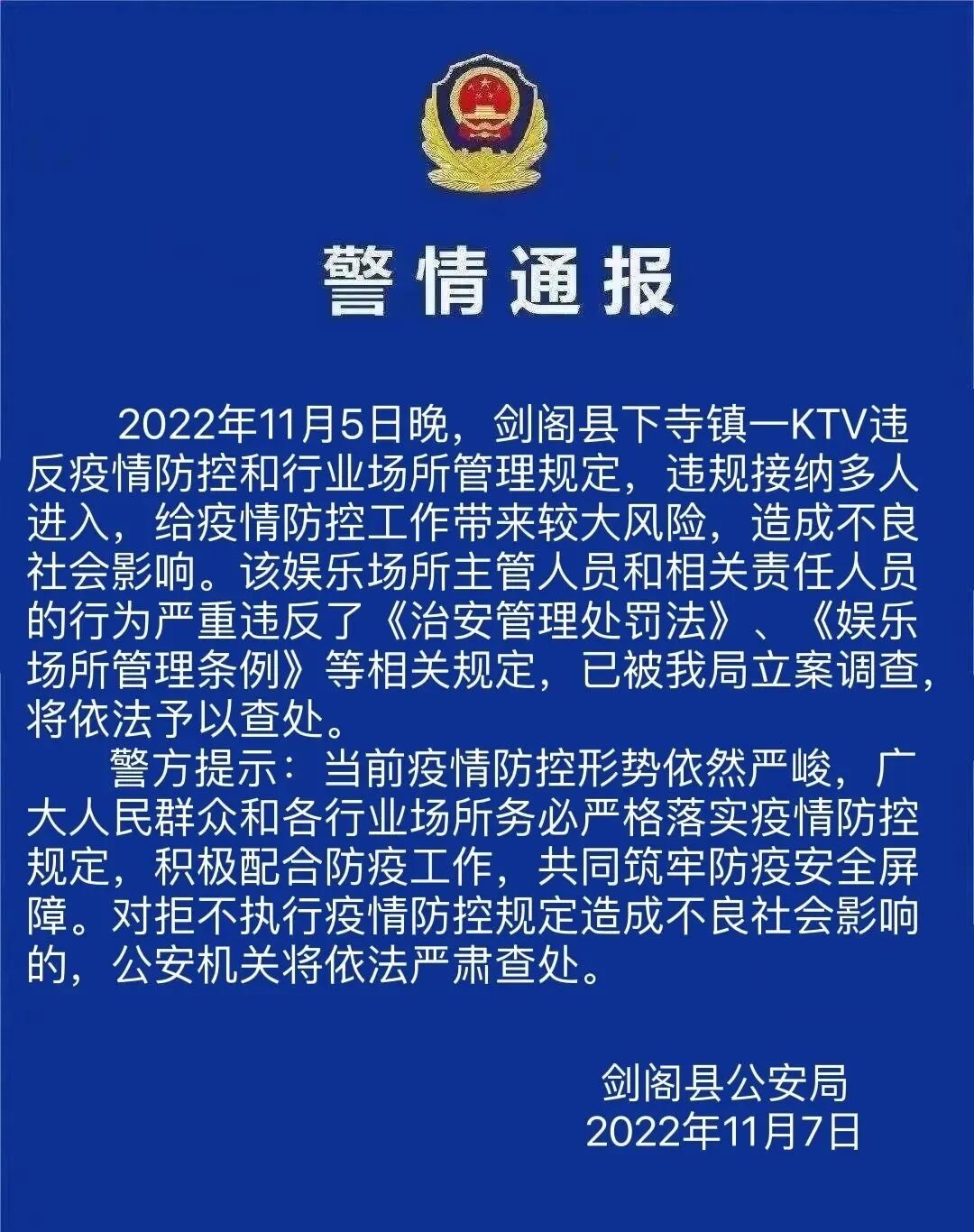 11月7日,剑阁县公安局发布警情通报,该县下寺镇一家KTV因为违反疫情防控规定,接纳多人进入,被剑阁警方立案查处。